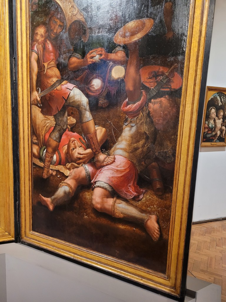 Az 1500-as években ugyan milyen eséllyel indult egy mű, ami olyan szintjét ábrázolja az erőszaknak, amiről az ember automatikusan elkapja a szemét, mert szinte szó szerint átütő a látvány? És ne feledjük, se kamerafunkció, se mobiltelefon nem létezett, maga a festmény volt a leggyorsabb terjesztési módja a képeknek.
