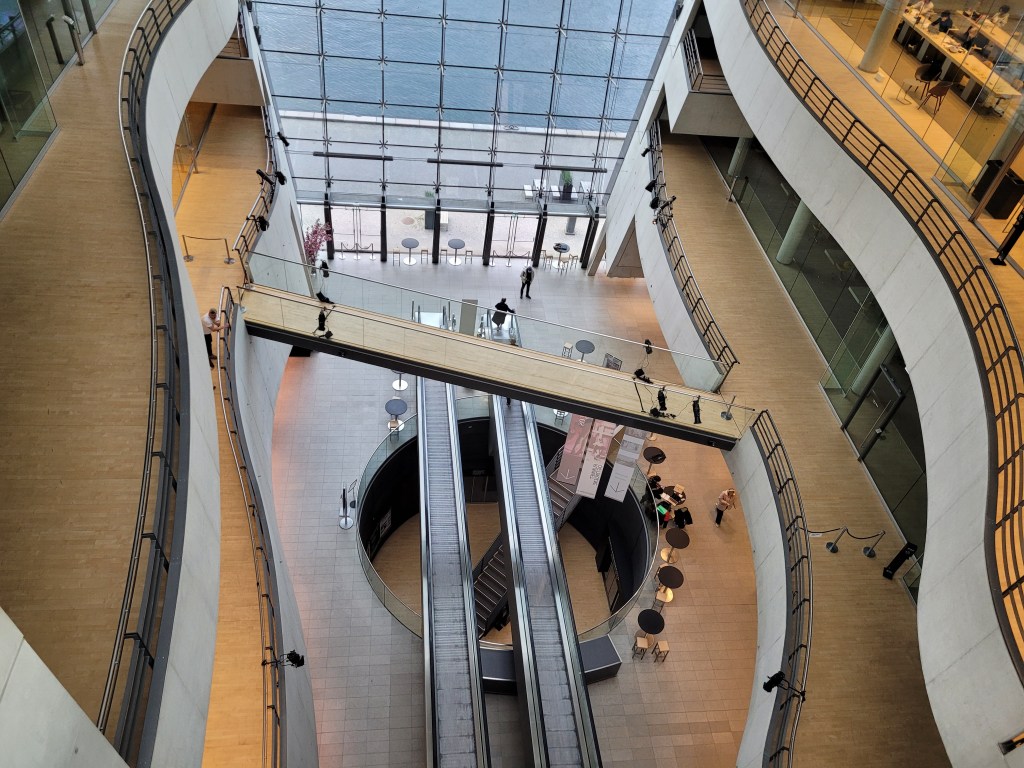 Koppenhága rögtön az első napon meghallgatta a kérésemet. Az útikönyvekben még szerepel is a királyi könyvtár, ami a blikkfangos „Fekete gyémánt” névre hallgat. Nekem aztán tényleg kevés ismerősöm hinné el, hogy nem szeretem a könyveket (nem is igaz), de azért annyira elvetemülten lelkes még én sem vagyok, hogy egy külföldi utazáson – különösebb ok nélkül – a helyi könyvtárban töltsem az időt. Ráadásul a Fekete gyémánt sarkán található az alternatív kis hableány szobor, ami egy bizonyos szögből egészen úgy néz ki, mintha a sellő kissé megtévedt technikával próbálná kinyomni az uthpluthi névre hallgató ászanát. A szobrot kellemesen a helyiekhez lassult tempóban megnéztem, lefotóztam, és ekkor megszólalt az intuícióm, hogy mégis csak be kellene menni. Továbbsétáltam, de a falak egy része átlátszó volt, és kiválóan látszott, hogy járkál bent néhány turista, akik az emeletre igyekeznek fotózni. Időm volt, végül is mit veszíthetek, így én is nekiindultam. Ezt a fotót készítettem fentről:
