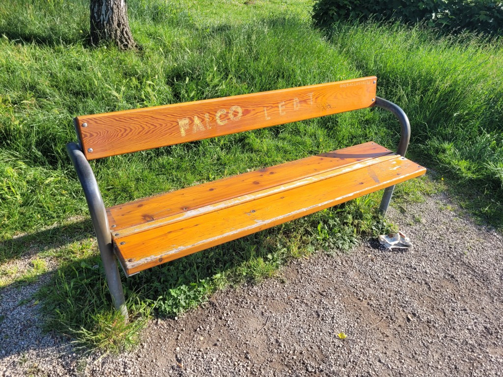 Falco sírja más szempontból is különleges volt. Az egész temetőben egyetlen megrongált padot sem láttam, osztrák precizitással volt karbantartva az összes. A Falco sírja melletti padra azonban valaki felvéste, hogy „Falco lebt”, azaz „Falco él”. A graffiti nem volt friss, látszott, hogy a temetőgondnokság is tud róla. Mintha mindig odatartozott volna, és az alkotó csak lehántotta a legfelső réteget, ami eltakarta a lényeget.